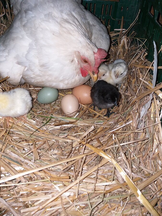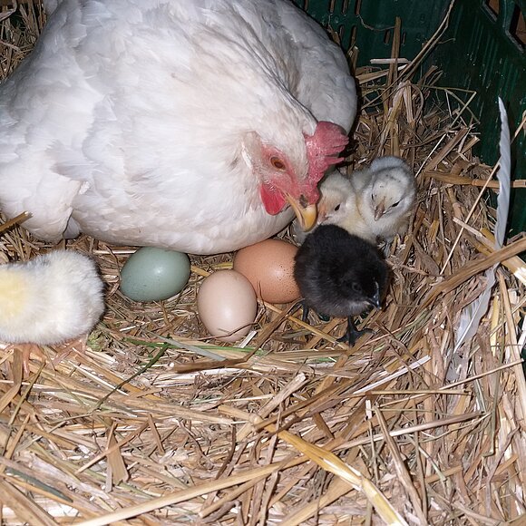 Selbst unsere Eier gibt es in verschiedenen Farben, ob weiß, braun, gesprenkelt oder grün, da wir verschiedene Hühnerrassen halten, die auch selber für Nachwuchs sorgen.